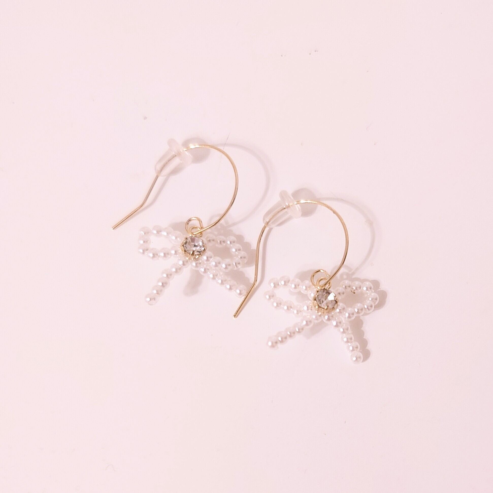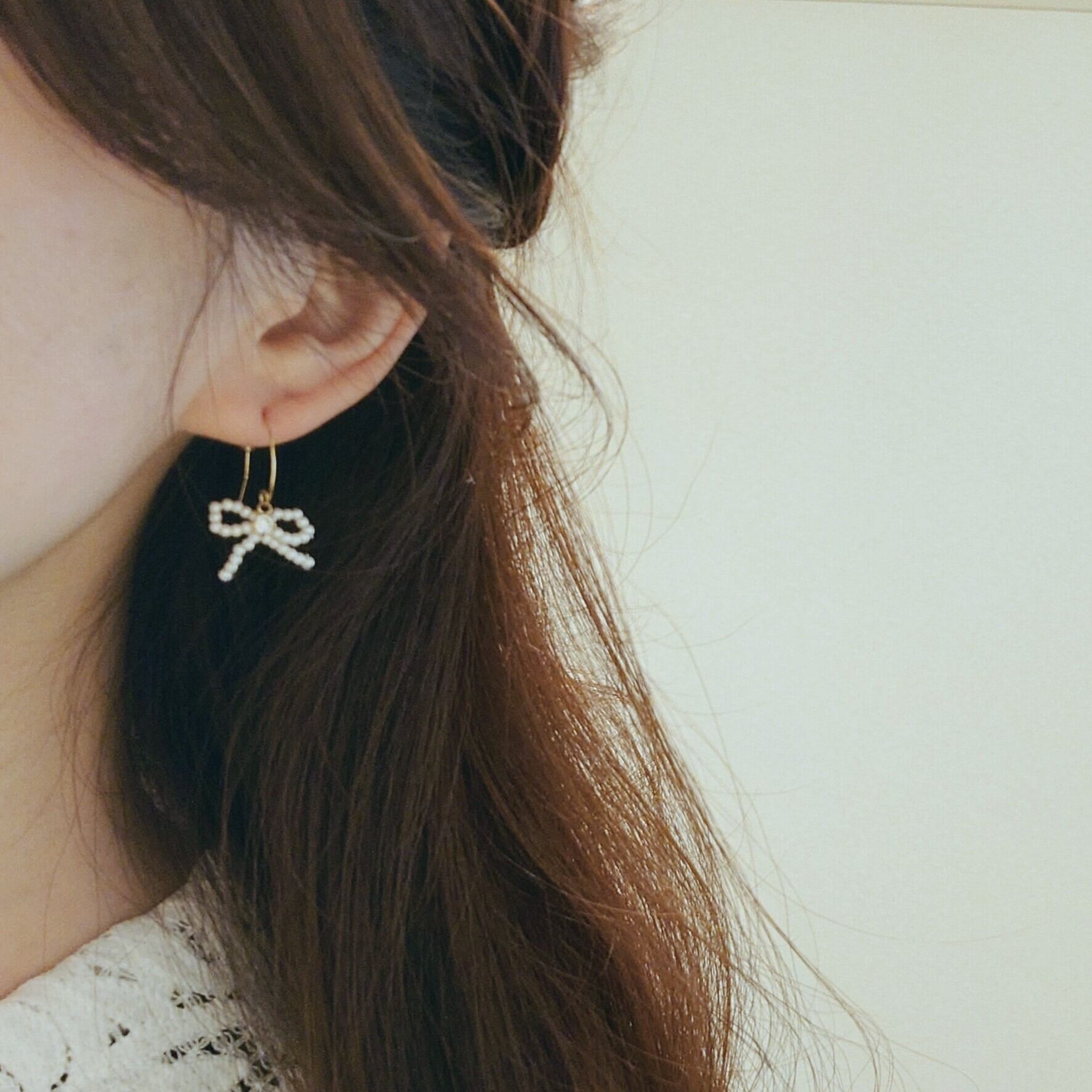 耳元を上品フェミニンな印象に導いてくれるパールリボンを使用しているピアスです。